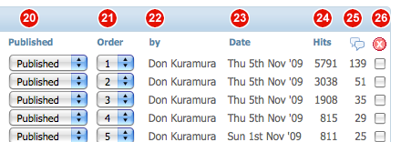 24: Hits: This displays the pageviews of each article. Clicking on "Hits" will sort the articles by pageview count. This is a great way of checking out which articles are the most popular.